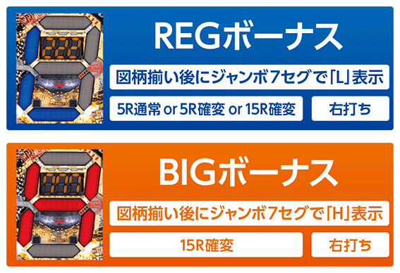メイン7セグで図柄が揃うと、続いてジャンボ7セグにてラウンド抽選が始まる。最終的に「H」が表示されると15R確変のBIGボーナス、「L」なら5R通常のREGボーナスとなるぞ。