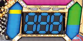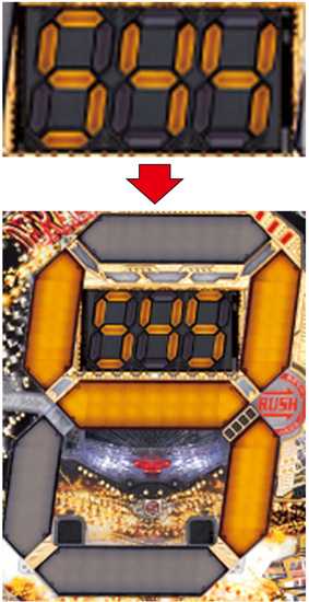 保留変化予告と連動して、ジャンボ7セグがフラッシュする演出。色は橙<青<黄<緑<赤の順に期待度がアップし、青以上はリーチ濃厚。