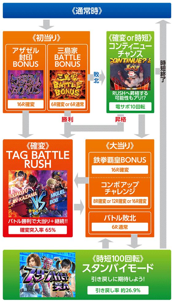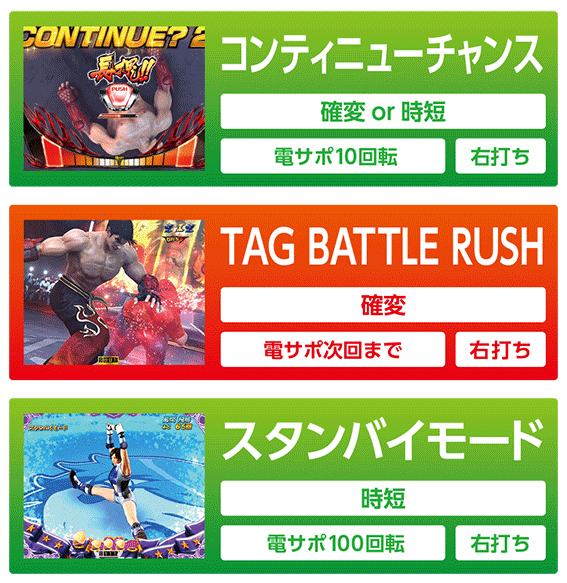 本機の確変モードで、アザゼル封印BONUS後・三島家BATTLE BONUS勝利後・コンティニューチャンスからの昇格で突入。滞在中は2対2のタッグバトルが繰り広げられ、バトルに勝利すれば大当り+モード継続。バトルに敗北した場合は6R大当りで時短・スタンバイモードへ突入する。