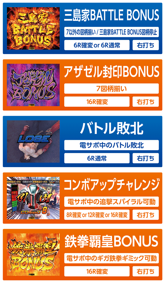 7以外の図柄揃い大当りは「一八」、三島BATTLE BONUS図柄停止は「平八」とのバトルが展開。バトルに勝利できれば確変・TAG BATTLE RUSHへ突入し、敗北した場合は電サポ10回転のコンティニューチャンスへ突入する。