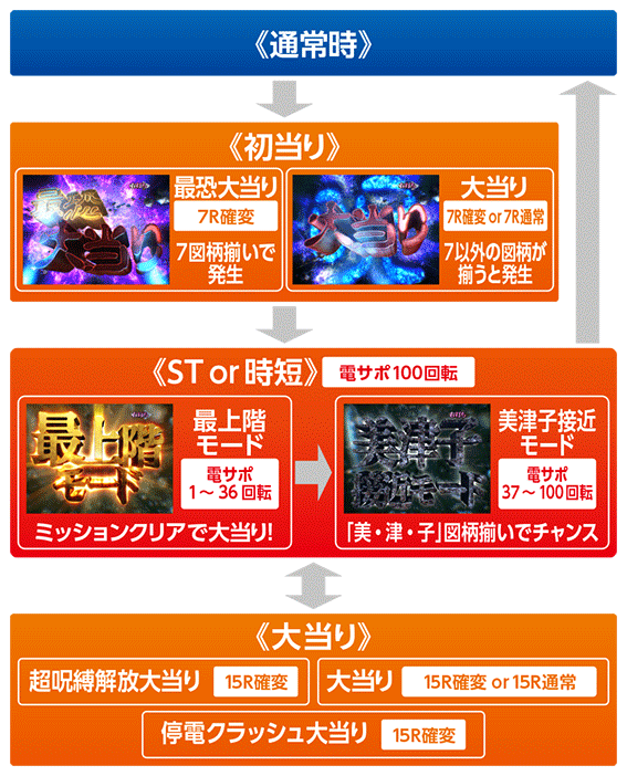 電サポ中に7以外の図柄が揃うと発生する、15Rの確変or通常大当り。終了後に突入する最上階モードは、STor時短となる。