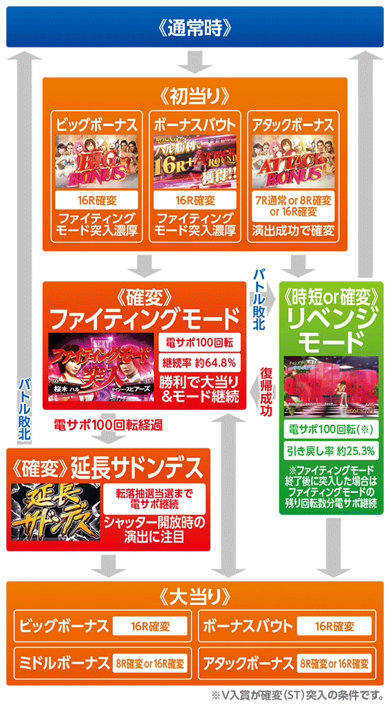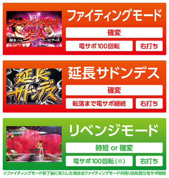 電サポ100回転の確変モード。基本的にバトルで勝てば大当り&モード継続。転落抽選に当選するとバトルに敗北してリベンジモード突入となるが、転落していなくてもバトルで負けることもある。100回転経過しても転落抽選に当選していなければ、延長サドンデスへ突入する。