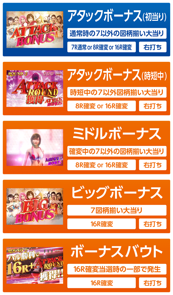 アタックボーナス中は、アタックラウンド獲得演出で成功すればファイティングモードへ突入。アタックラウンド獲得演出は一度の大当り中に複数回発生することがあり、一度でも成功すればOKだ。なお、獲得演出に失敗して大当りが終了したと思いきや、いきなりアタックラウンドが発動してエクストラボーナス(16R確変)に昇格する逆転パターンも存在するぞ。