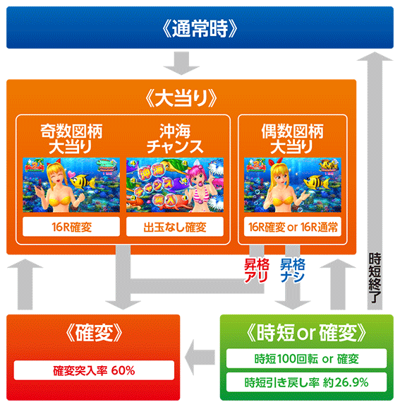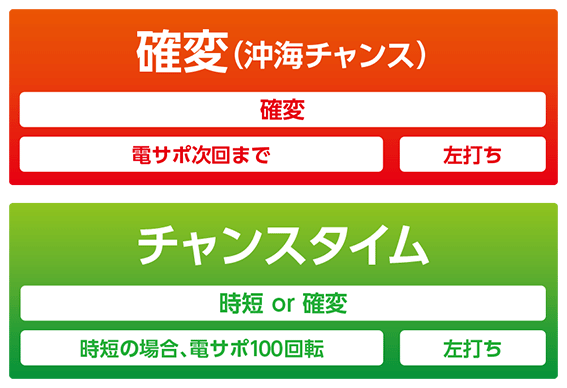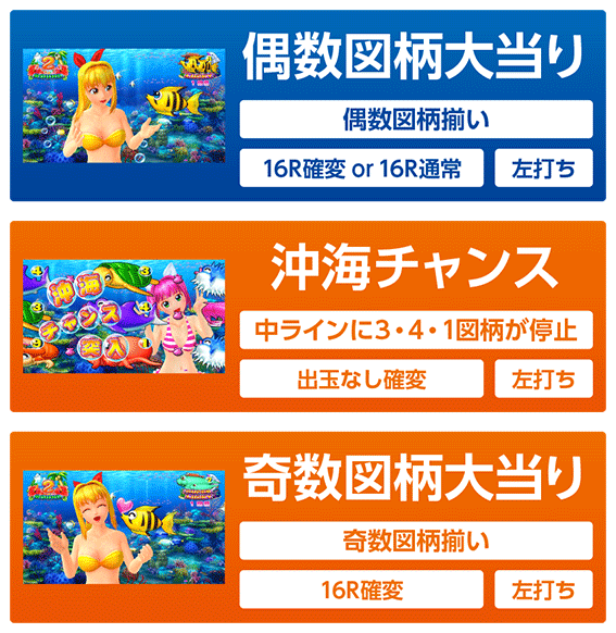 中ラインに3・4・1図柄停止で突入する確変モード(出玉なし確変)で、突入タイミングは変動中、ノーマルリーチ中、スーパーリーチ中など多彩。沖海チャンスと思いきや、ハイビスカスフラッシュが発生すれば16R確変の沖海ボーナスにジャンプアップ!