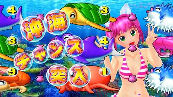 中ラインに3・4・1図柄が停止すると突入(出玉なし確変)。沖海チャンスと思いきや、ハイビスカスフラッシュが発生して16R確変の「沖海ボーナス」へ昇格することも!!