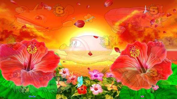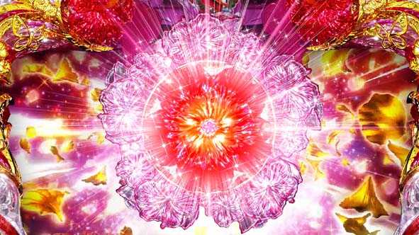 キュインと大当りを告げるハイビスカスフラッシュは前作よりも巨大に!! 落下すれば確変大当り濃厚!?