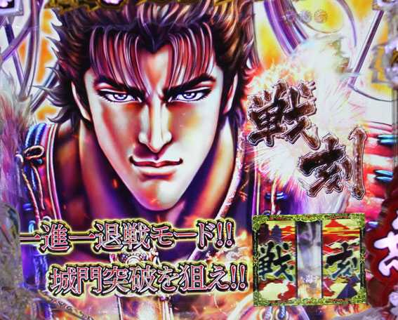 戦モードの1つ。大当りラウンド中、または戦モードの変動中にボタンを押すと戦RUSHにするか猛RUSHにするか選択できる。基本的に次回大当りまで電サポが継続し、慶次シリーズを象徴する城門突破演出での大当りがメインとなる。また、分岐キャラ演出で本陣急襲演出へ発展すると戦RUSH終了のピンチとなる点も、シリーズを通して変わらないぞ。