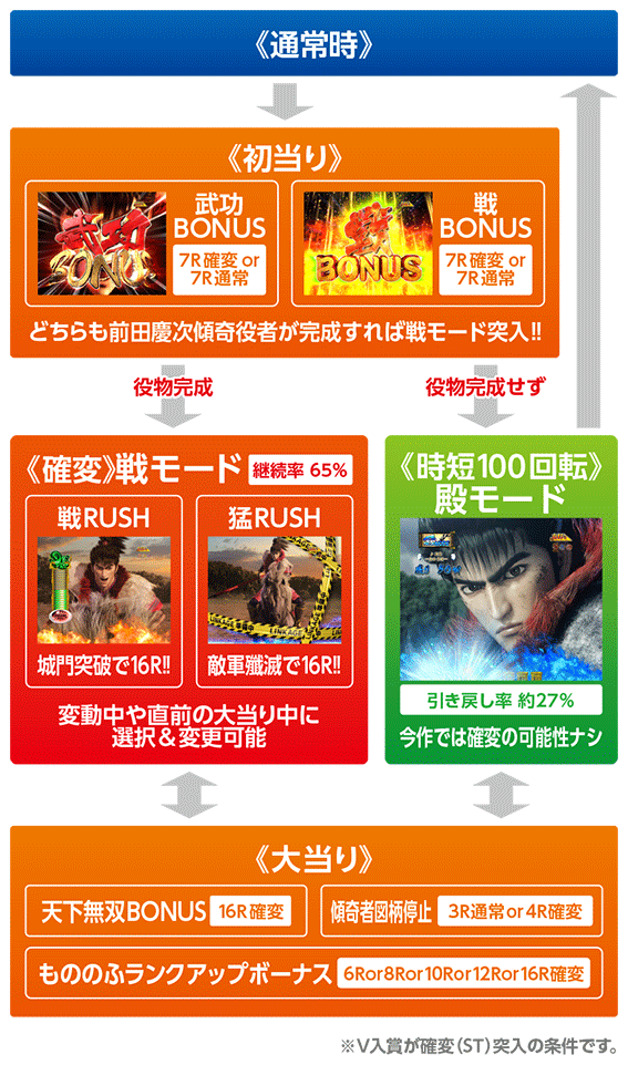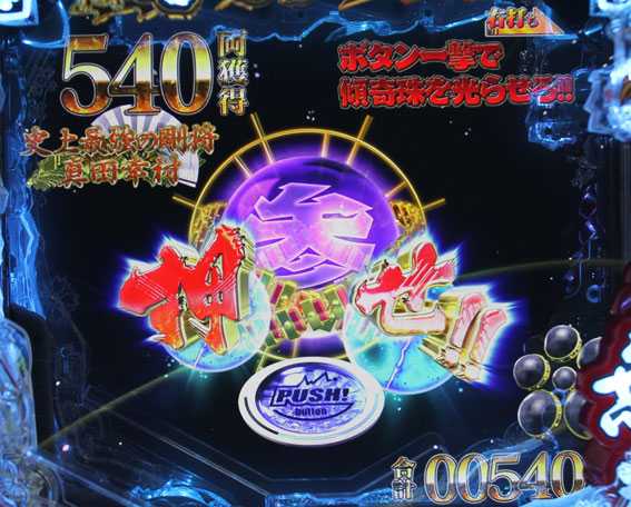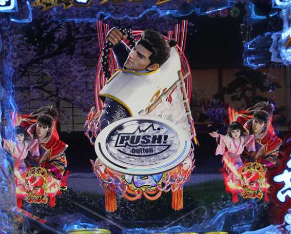 通常時に発生する7Rの確変or通常大当り。ラウンド中にボタンPUSHで前田慶次傾奇役者が完成すれば戦モード突入濃厚だ。また、戦モード中の演出を「戦RUSH」と「猛RUSH」のどちらかから選択できるぞ。さらに、戦モード中の演出傾向を通常パターンか一発告知のどちらかから選択可能だ。
