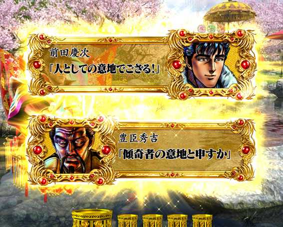 傾奇ZONE経由で発生する風流LINKAGE演出で、ボタンPUSHでロゴ役物が落下すると発展。歴戦の猛者たちとともに小田原攻めに参加する慶次の口上を楽しめる特殊リーチだ。