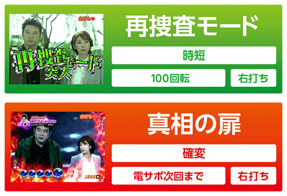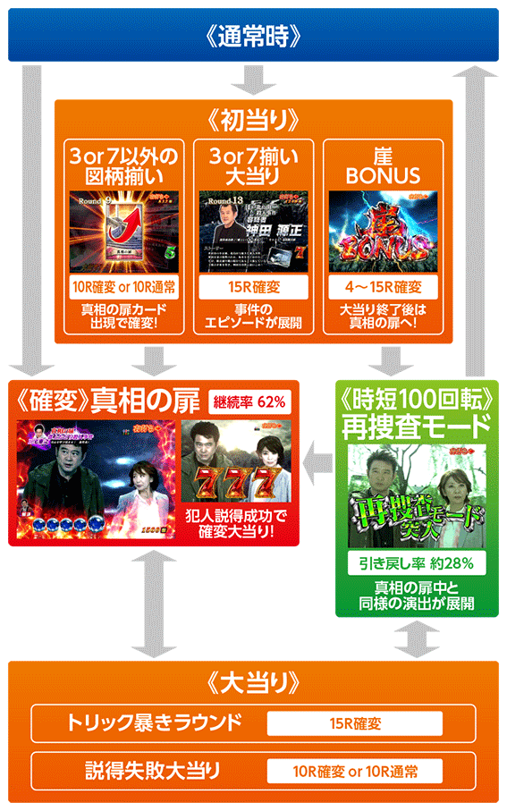 通常時に3or7以外の図柄が揃った場合、ラウンド中に克也が真相の扉カードを出現させれば10R確変&真相の扉突入。カードが出現しなければ10R通常となり、大当り終了後は再捜査モードに移行する。