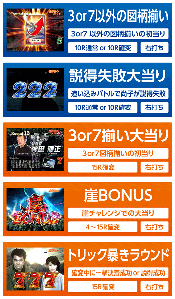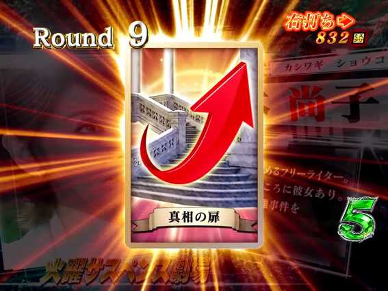 初当りが3or7以外の図柄揃いだった場合、ラウンド中に克也が真相の扉カードを出現させれば10R確変大当りとなり、ラウンド終了後は電サポ確変の真相の扉に突入。何も起きなければ10R通常大当りとなり、ラウンド終了後は時短の再捜査モードに突入する。