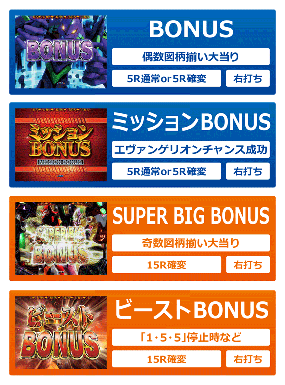 BONUS(偶数図柄揃い大当り)中は、レバーアイコン出現時にレバーを引いて初号機が登場すれば5R確変に昇格する。