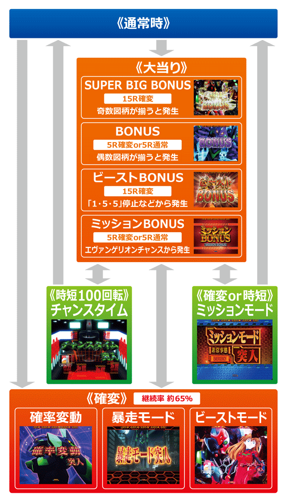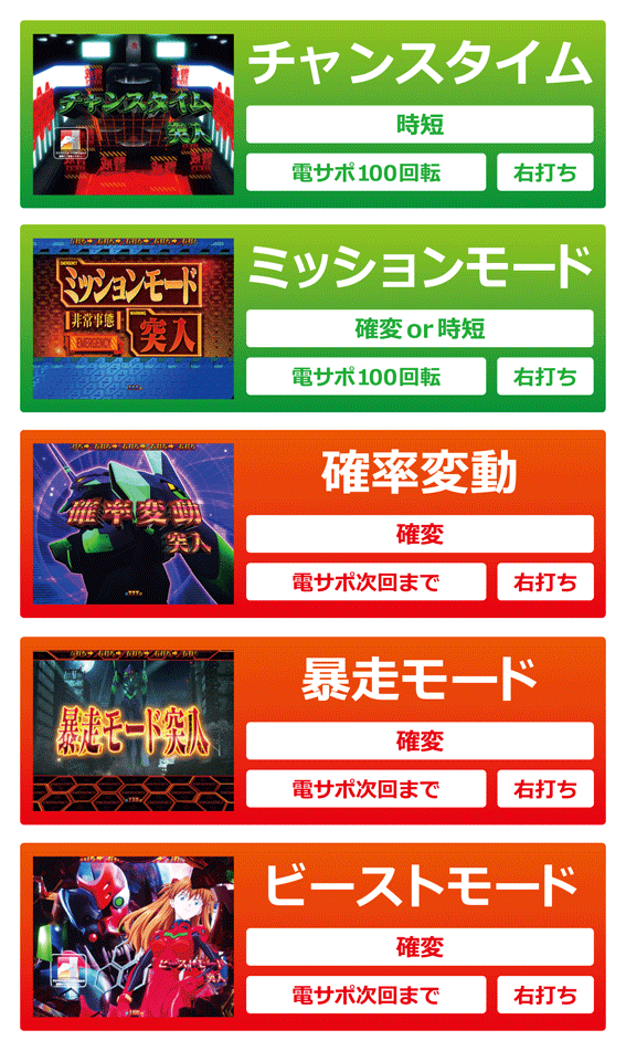 エヴァンゲリオンチャンスで「ミッションBONUS」のパネルが停止した時などに発生。5Rの通常or確変大当りで、終了後はミッションモードへ移行する。
