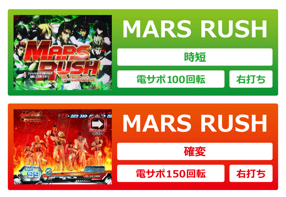 MARS BATTLE BONUS中の演出に失敗すると突入。見た目や液晶演出はSTのMARS RUSHと同じだが、コチラは100回転の時短モードとなっている。時短中の引き戻し期待度は約26.9%で、当たれば16R濃厚&ST突入となる。