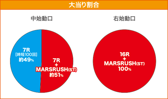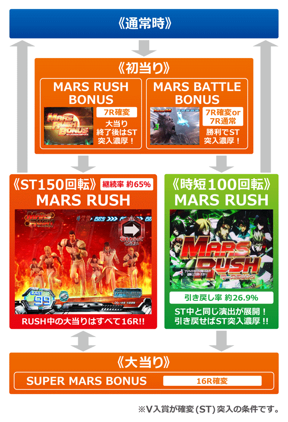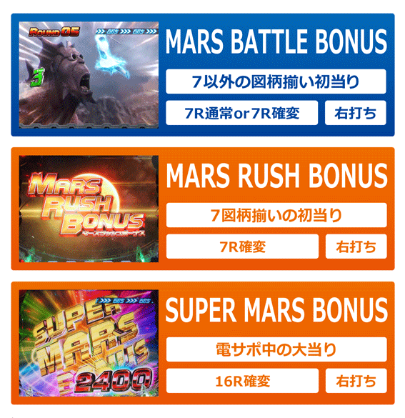 電サポ中の大当りはすべて16R確変となり、このボーナスが発生。大当り終了後はSTのMARS RUSH継続or突入となる。