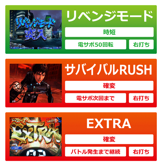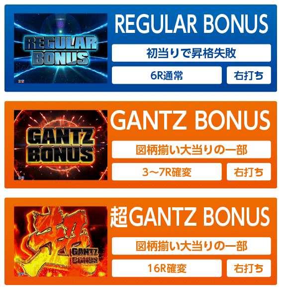 | 変動中演出 | ・GANTZ文字予告(チェッカー柄背景・次回予告発展) ・GANTZ連続予告(3連) ・GANTZゾーン ・超転送 |