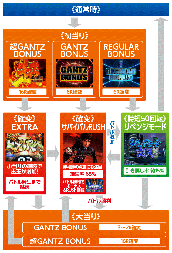 次回大当りまで電サポが続く確変モード。星人とのバトルリーチで勝利すればRUSH継続&確変大当りとなり、採点演出が発生。ココで100てんを取れば超GANTZ BONUS、それ以外ならGANTZ BONUSに当選する。バトルで負けると出玉なし当りとなり、50回転時短のリベンジモードへ移行するぞ。