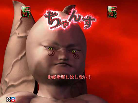 | トータル:9.7% ・テロップ赤:34.6% ・背景に赤い月:53.3% ・バスの落書き「ちゃんす」:50.9% ・バスの落書き「激あち」:90.2% ・終盤に「GANTZ」カットイン:48.1% ・GANTZフラッシュ発生:78.9% サプライズボタン:超激アツ |
