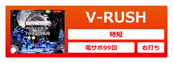 通常時の7図柄揃いの一部で発生。8Rの大当りで、発生時点でV-RUSH突入濃厚。
