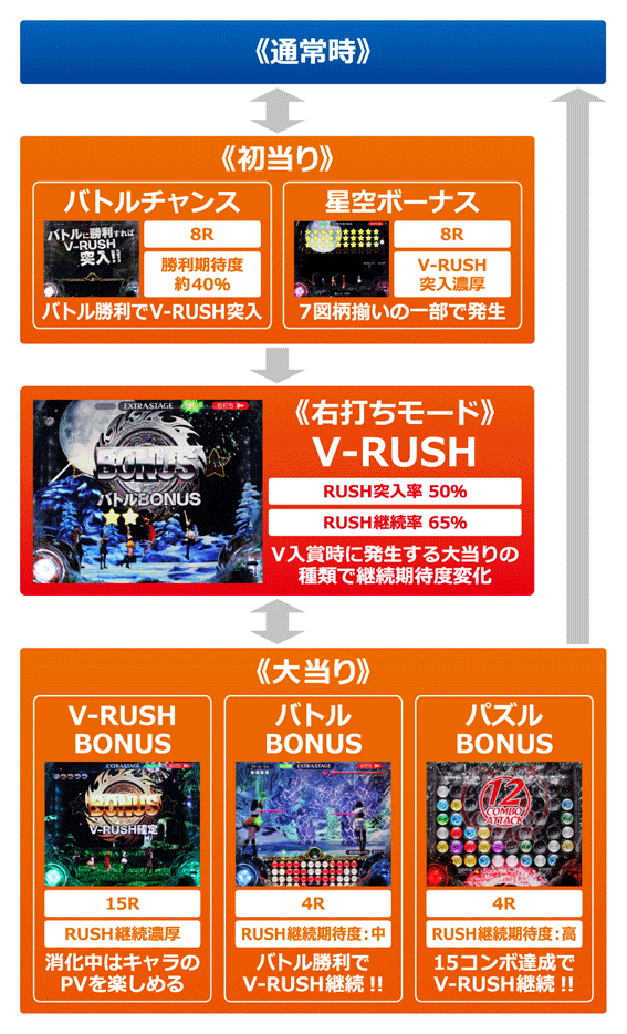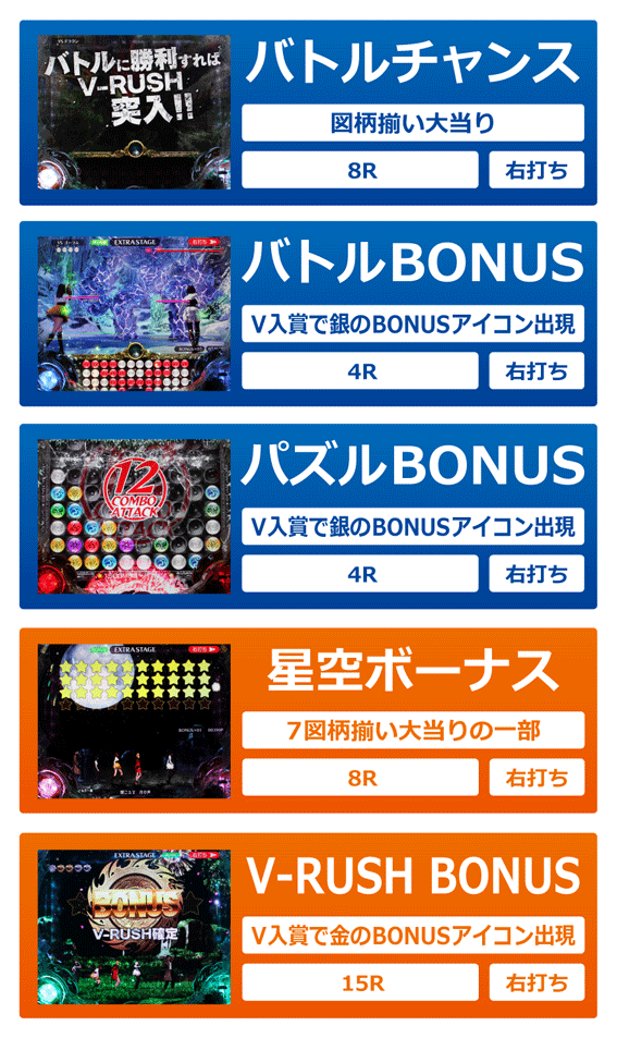 V入賞後に銀のBONUSアイコン出現で発生の可能性がある4R大当りで、バトルBONUSより継続期待度が高い。パズル演出で15コンボを達成できればV-RUSH継続、失敗で通常モードに戻る。