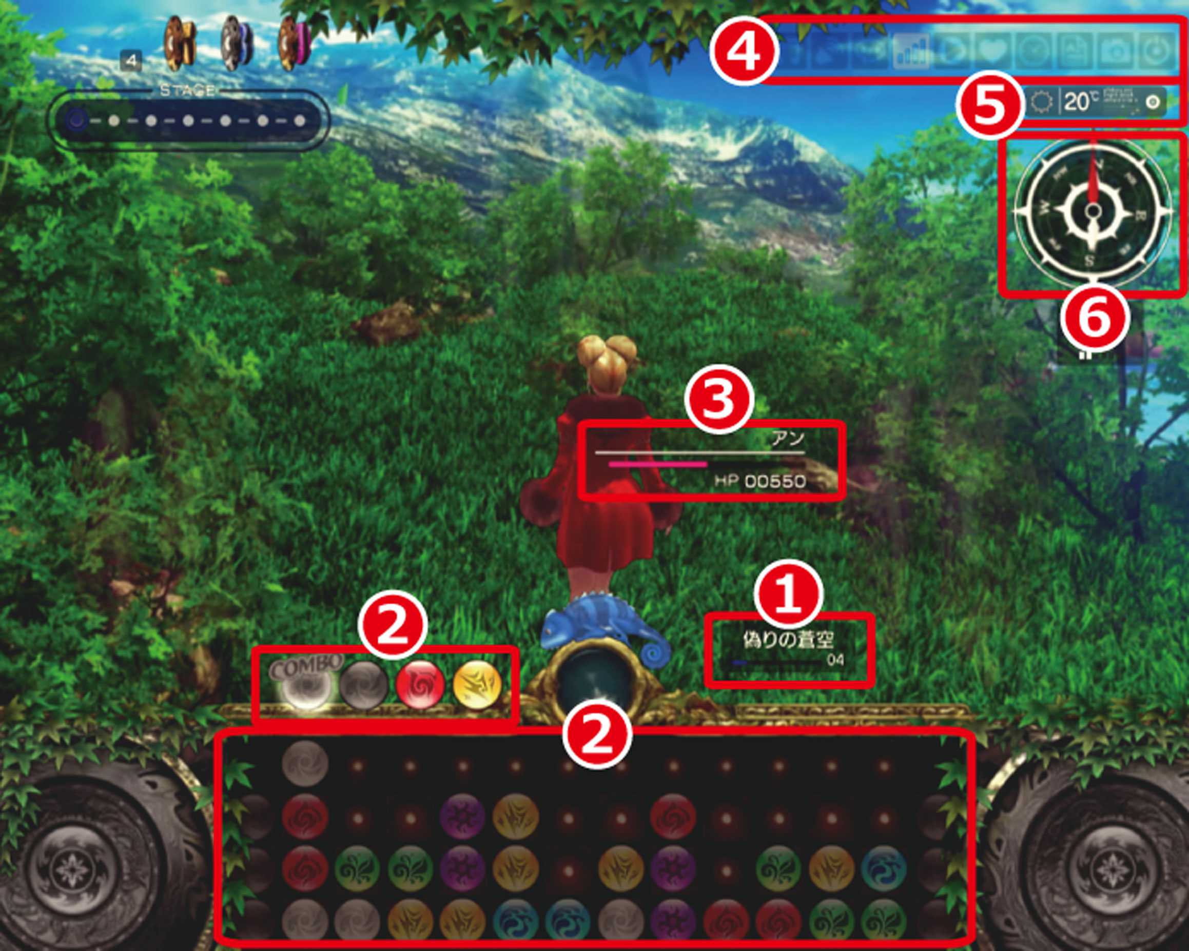 | ⑥方位磁石 | ステージと方位磁石が示す方角は固定だが、 その法則が崩れると期待度41%!! ■偽りの蒼空ステージ・・・北が基本 ■眠りの遺跡ステージ・・・北東が基本 ■裏切りの砂丘・・・東が基本 ■嘆きの断崖・・・南東が基本 ■迷いの洞窟・・・南西が基本 ■誘いの王都・・・南が基本 ■絶望の雪原・・・西が基本 |