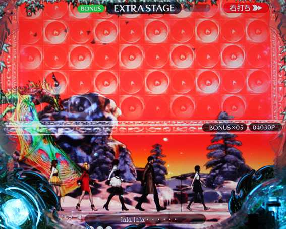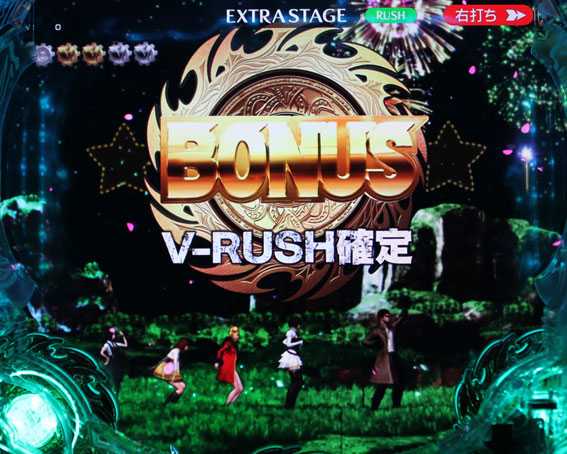 V入賞後に金のBONUSアイコン出現で発生する15R大当り。V-RUSH継続濃厚で、ラウンド中は主要キャラクターのオリジナルPVを堪能できる。