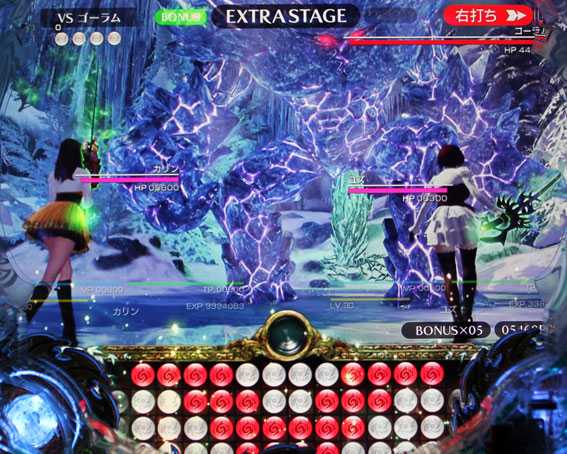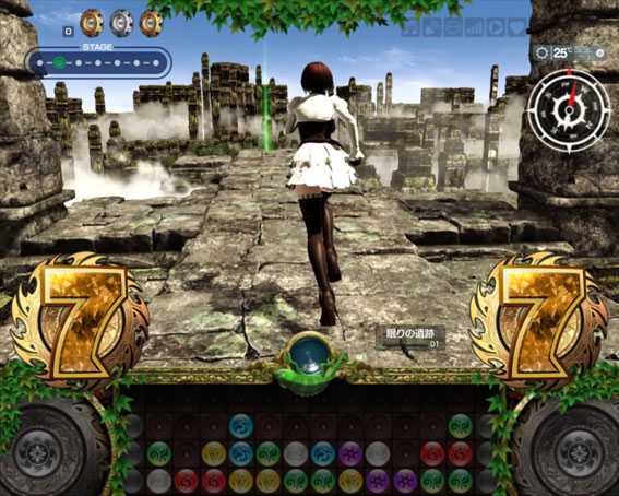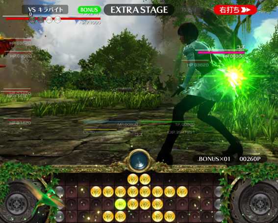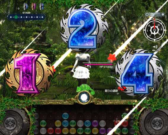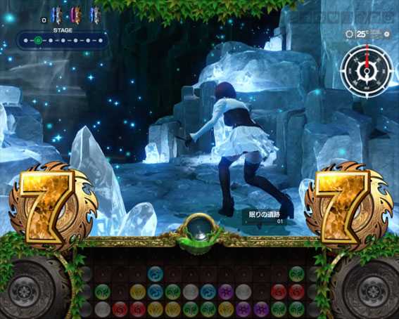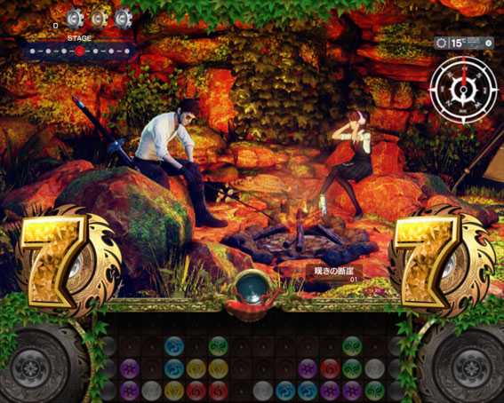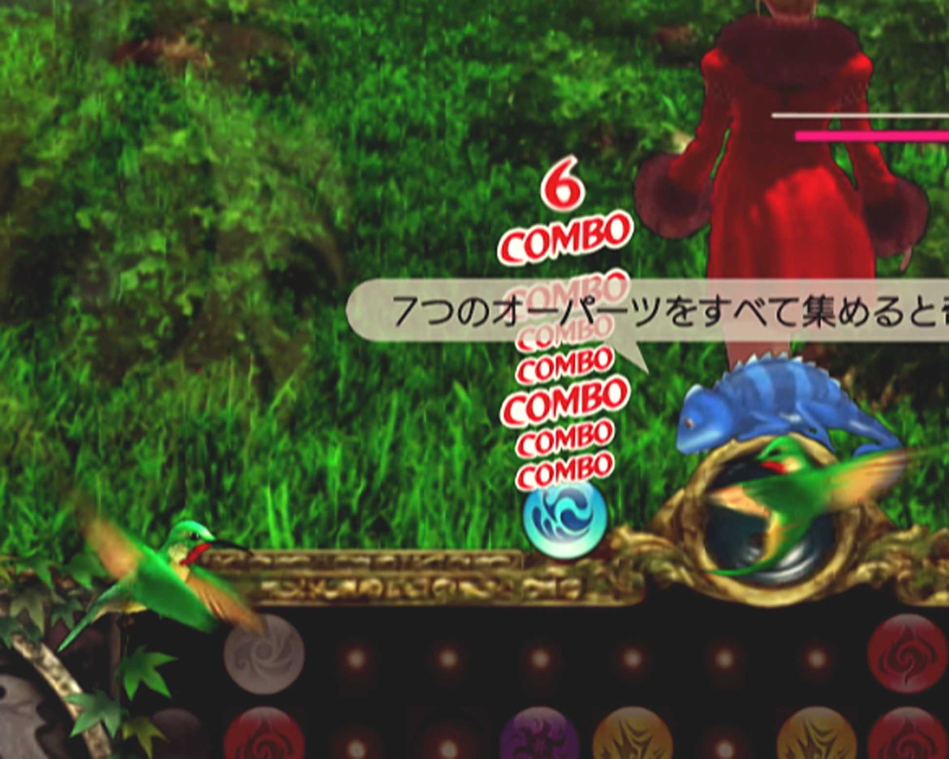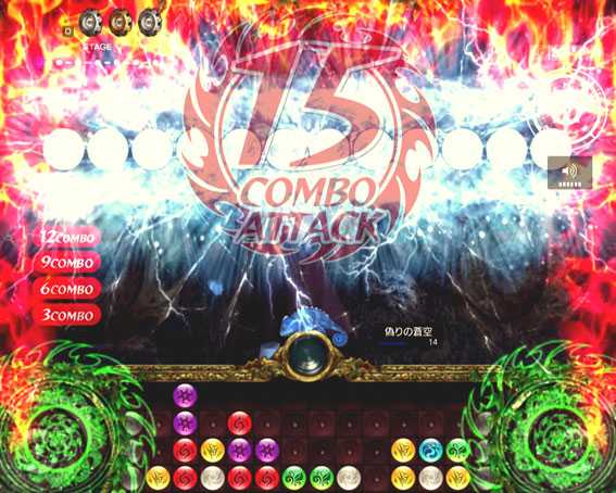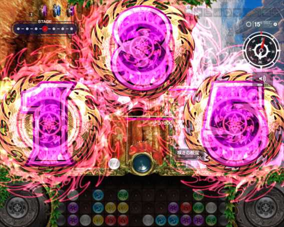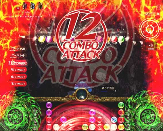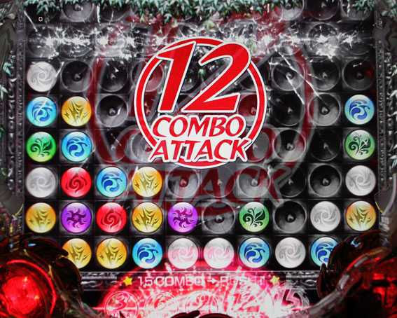 | ②保留&パズル表示 | 保留を消化すると、その保留は液晶下部の パズル領域に移行しオーブとなる。 オーブの色は6種類あり、縦or横で白以外のオーブが 並ぶと消滅し「COMBO」が発生する。 |