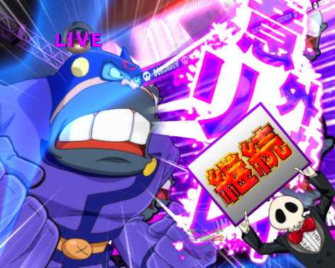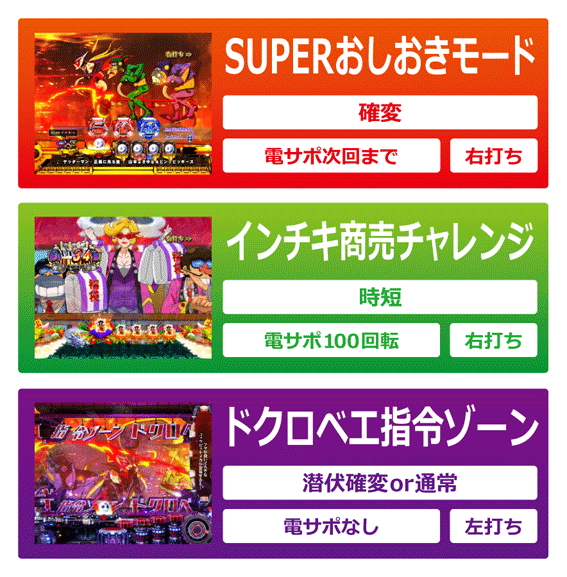 偶数図柄が揃った後、メガパトが発光しないと発生。6Rの確変or通常大当りで、終了後はインチキ商売チャレンジかSUPERおしおきモードに移行する。