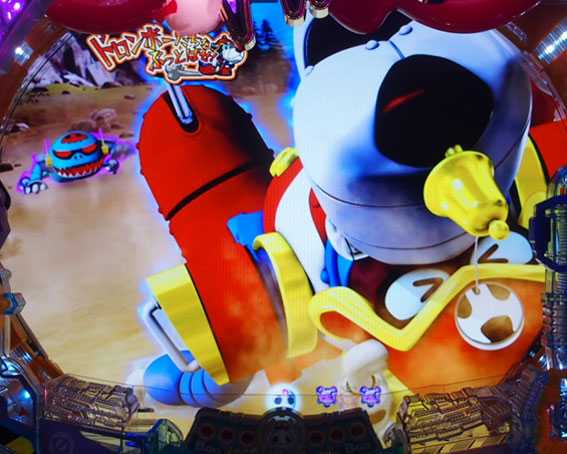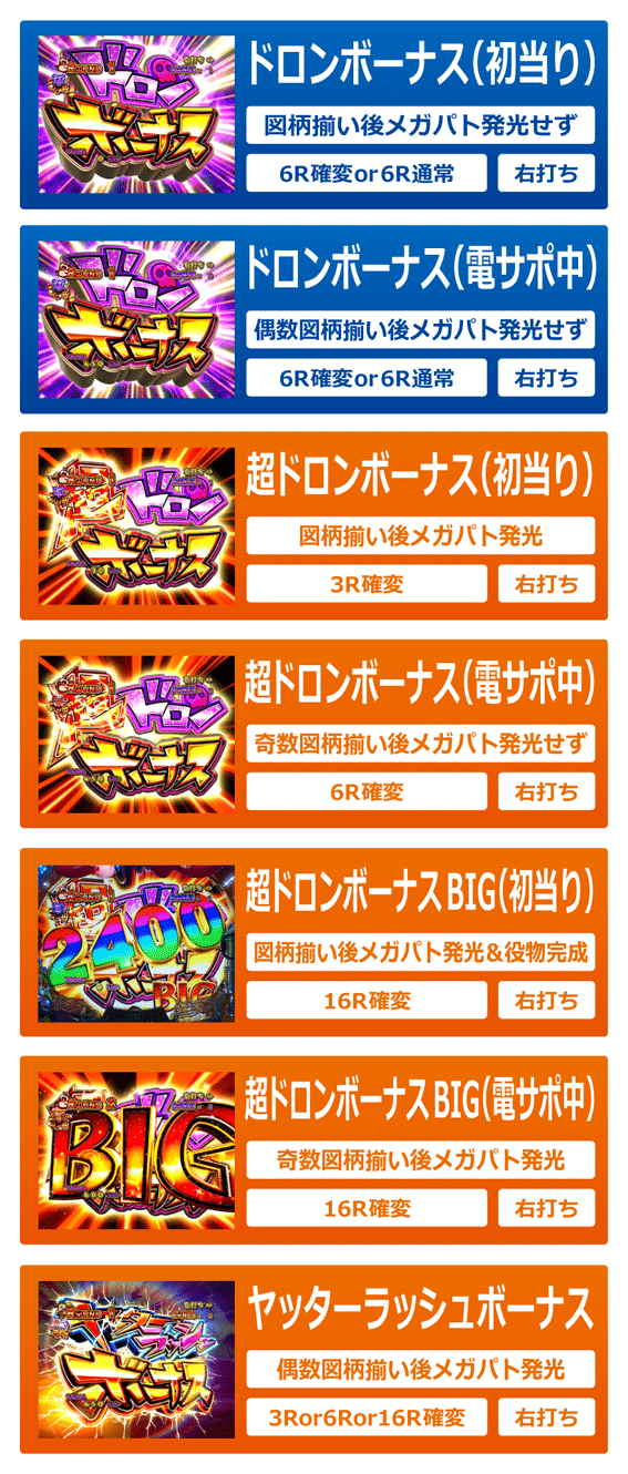 16Rの確変大当り。通常時だと、メガパト発光後にビッグドロンボーギミックが作動すると発生。電サポ中は奇数図柄揃い後にメガパト発光で発生する。