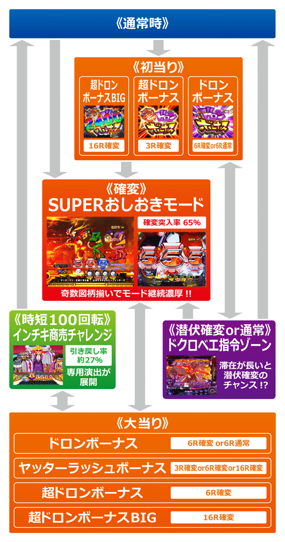 通常時のドロンボーナス終了後に突入。潜伏確変の可能性があり、潜伏確変状態であればロング継続しやすい。
