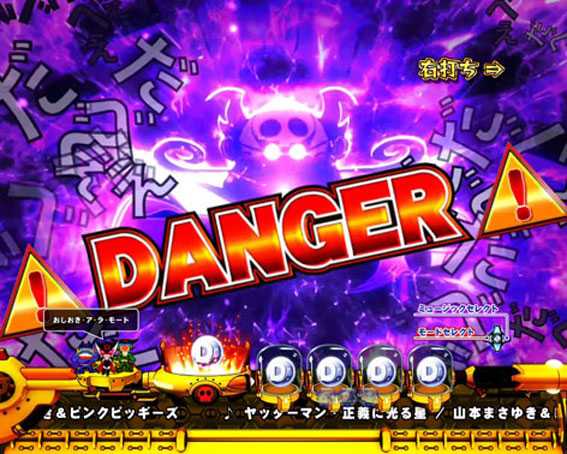 「DANGER」の文字出現で偶数図柄リーチのピンチだが、ヤッターマンが登場して奇数リーチに発展することもあるぞ!
