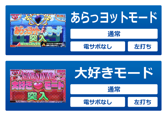 わくわくスタート入賞時に獲得できる大好きPOINTが5個貯まると突入する通常モード。演出内容が変化するだけで確変などの可能性はないため、あらっヨットモード同様に即ヤメしてもOKだ。