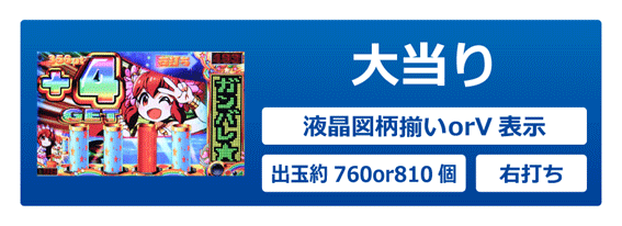 図柄揃い時、V表示出現時、花まる大当り獲得時に発生。上乗せがなく終了した場合の出玉は約760or810個で、上乗せが発生したり花まる大当りを獲得すればさらに出玉が増えるぞ!