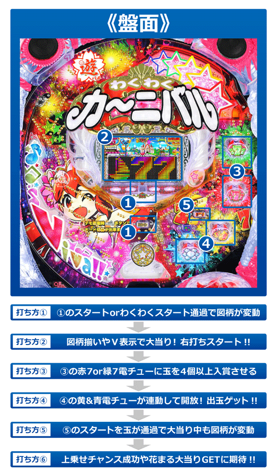 ①のわくわくスタートorスタートを玉が通過すると図柄が変動。図柄が揃うかVが表示されると大当りとなり③の電チューが開放。スタートで当たった場合は赤電チュー、わくわくスタートでの大当りなら緑電チューが開放する。ココで玉を4個入賞させないと大当りが始まらないので注意しよう。あとは④の黄電チューと青電チューが連動して開放するので、そこに玉が入賞することで出玉を増やすことができるぞ。なお、大当り中は右スタートを玉が通過すると図柄が変動。上乗せチャンスが発生すれば出玉上乗せが期待でき、花まる大当りGETなら当該大当り終了後に次回の大当りが発生する。
