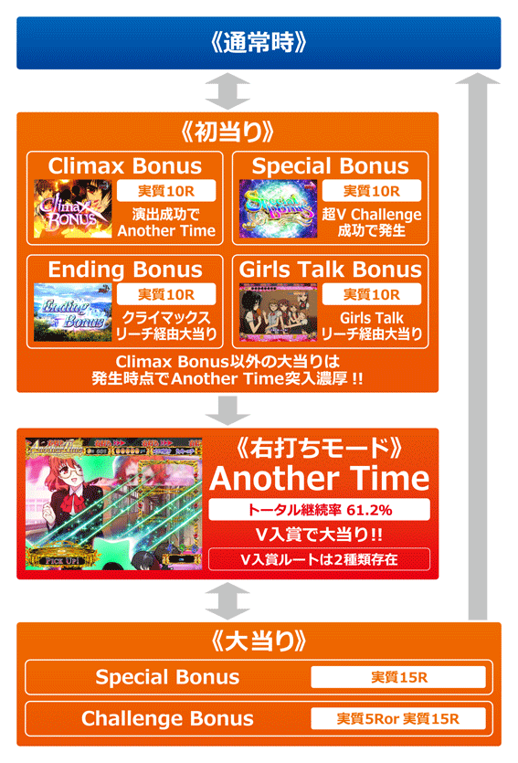 通常時にClimax Bonus図柄が止まると発生する実質10R大当り。ラウンド中の演出をクリアできればAnother Time突入、失敗で通常モード(合宿モード)に戻る。