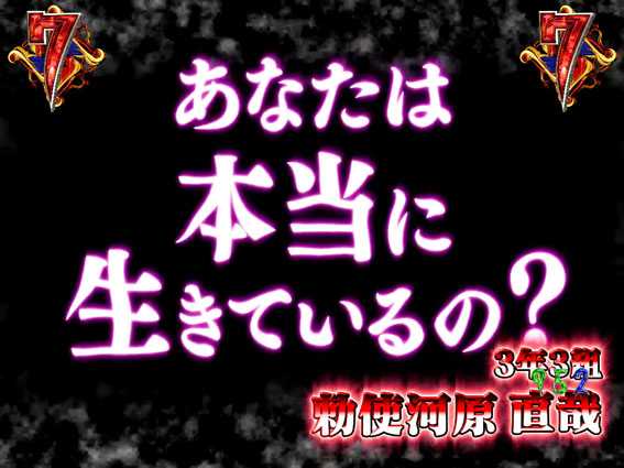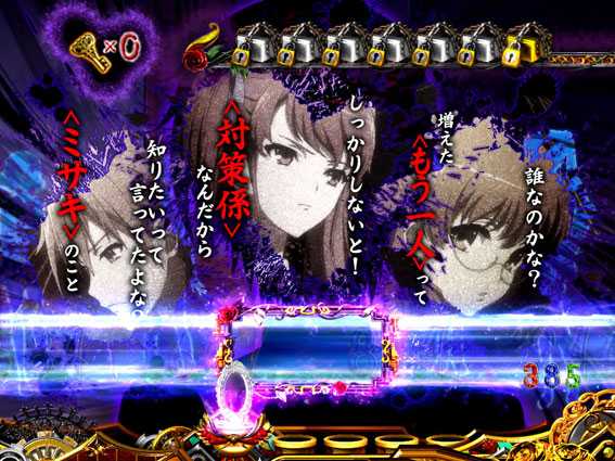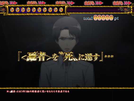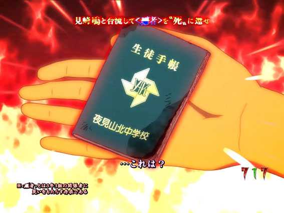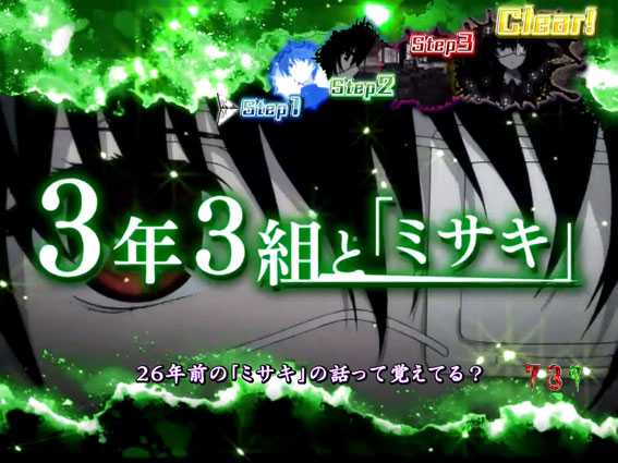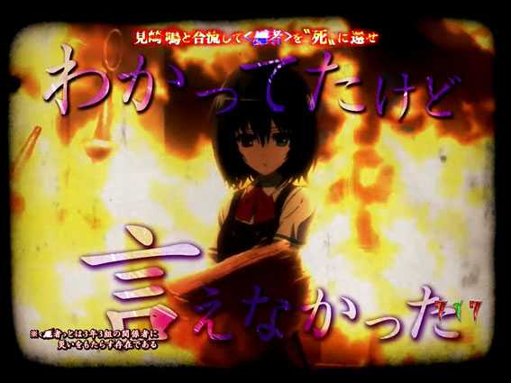見崎が〈死者〉を断定するリーチ。無数に出現する「誰-?」の文字色が赤やデンジャー柄だとチャンスアップだ。