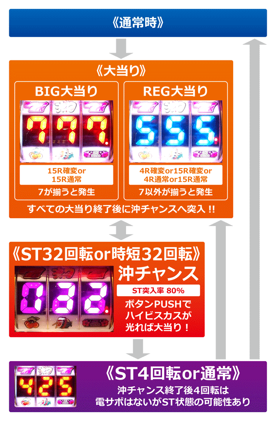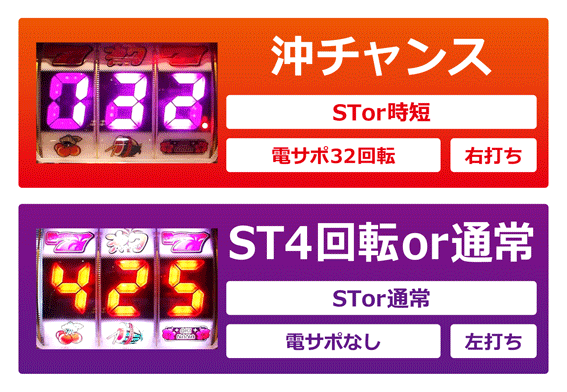 沖チャンス終了後に突入。見た目は通常時と同じで電サポもないが、内部的にST状態の可能性があるので、沖チャンス終了後は必ず4回転回してからヤメるようにしたい。