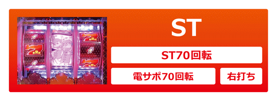 50回転継続し、継続率は約60.7%。ドラムが赤くなって専用のBGMが発生する以外、演出は通常時と同じものが展開する。なお、ST中は大当りの70%が16Rのため、ツボにハマった際の出玉力は高い。
