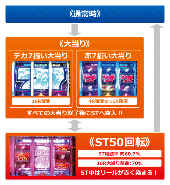 赤7揃いの大当りは基本的には4Rだが、16Rに昇格する可能性もある。大当り終了後はSTに突入する。