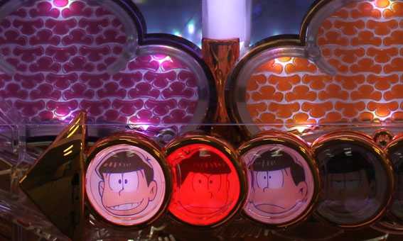 キャラ図柄停止時やリーチ後などにしゃべる六つ子には特徴がある。なお、しゃべっているキャラとドラム上下にある松ランプはリンクしており、例えば上記画像は青の松ランプが光っているため、カラ松がしゃべっている状態となる。
