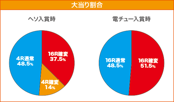 電サポ中に図柄が揃うと発生する、16Rの確変or通常大当り。終了後は確変or時短100回転の沼RUSHに突入する。
