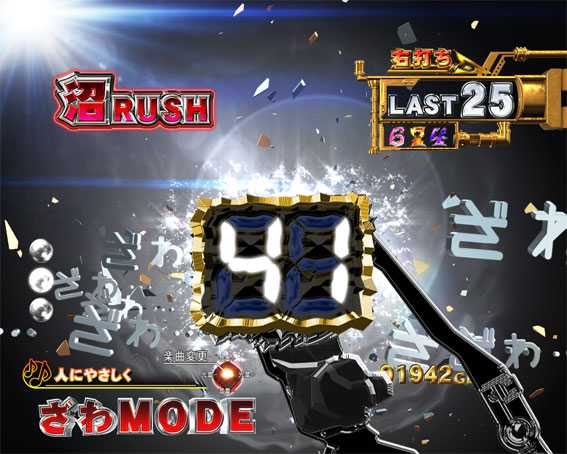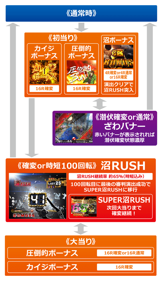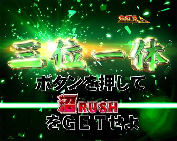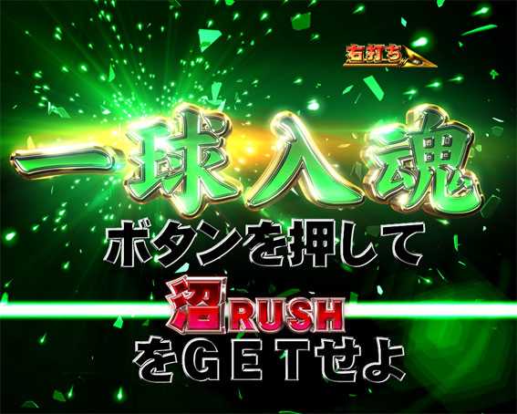 電サポなし時に7or天以外の図柄が揃うと発生。ラウンド中はRUSH獲得演出が展開し、成功で4Ror16Rの確変大当り&沼RUSH突入。失敗すると4R確変or4R通常となり、ざわバナーに移行。