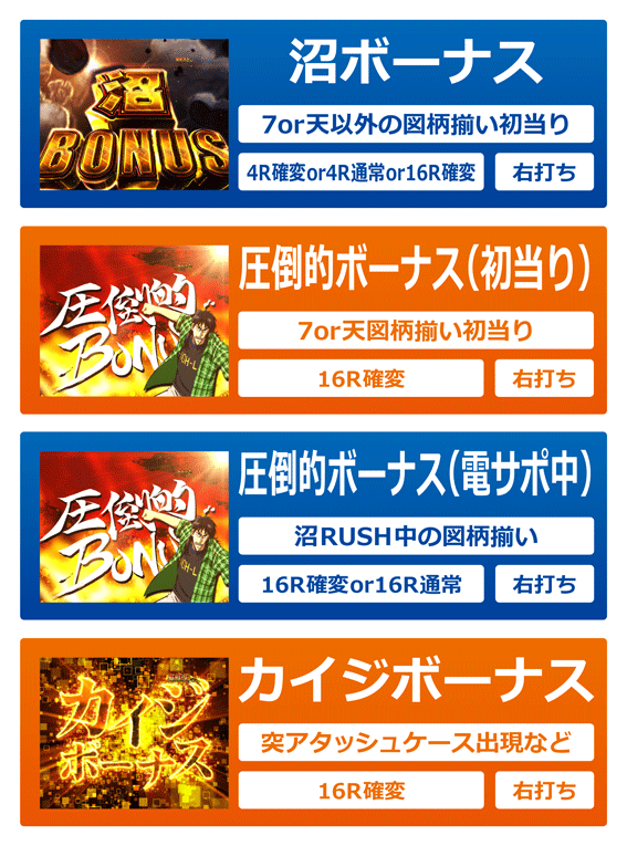 | 変動中演出 | ・通常擬似連(3連・赤エフェクト) ・キャラストーリー擬似連(カイジ登場・帯色がイチゴ柄) ・強運チャンス ・フリーズギロチン ・運否天賦チャンス |