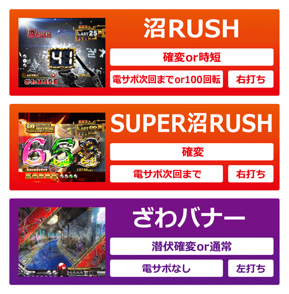 沼RUSHが内部的に確変で、かつ100回転を過ぎた場合に突入。確変状態濃厚で、次回大当りまで電サポが継続する。
