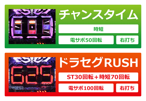 通常時の全大当り終了後に突入。50回転の時短で、引き戻し率は約40%。ココで当たると晴れてドラセグRUHSに突入する。消化中は専用の予告に加え、通常時と共通のリーチが発生する。