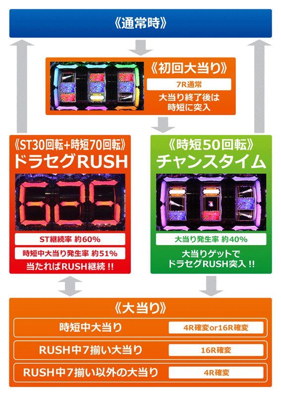 電サポ中に7が揃うと発生する16R確変。終了後はドラセグRUSH継続となる。