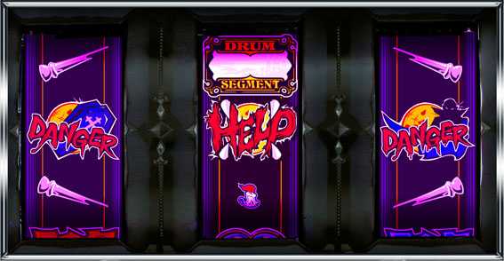 DANGER図柄テンパイ後、中リール中段にHELP図柄停止で発生。その後はHELP図柄が停止するたびに、発展するリーチが格上げされていく。
