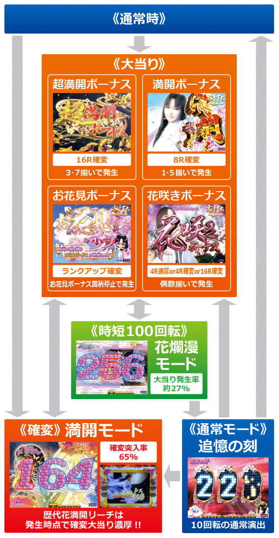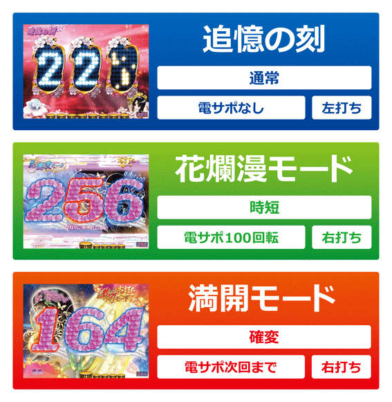 次回大当りまで電サポが続く確変モード。大当りの多くがノーマルリーチor花満開リーチ経由で発生し、後者ならチャンス。また、電サポ中専用の歴代花満開リーチは、発生時点で確変大当り濃厚だ!