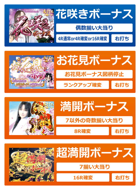 | 変動中予告 | ・保留変化(赤) ・桜華の刻 ・ほのかカットイン予告 |