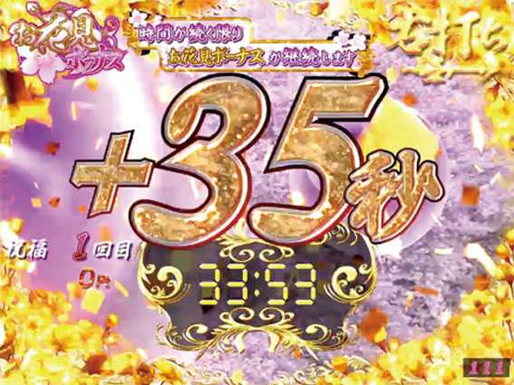 3・7図柄が揃うと発生する16R確変大当り。終了後は満開モードへ移行する。